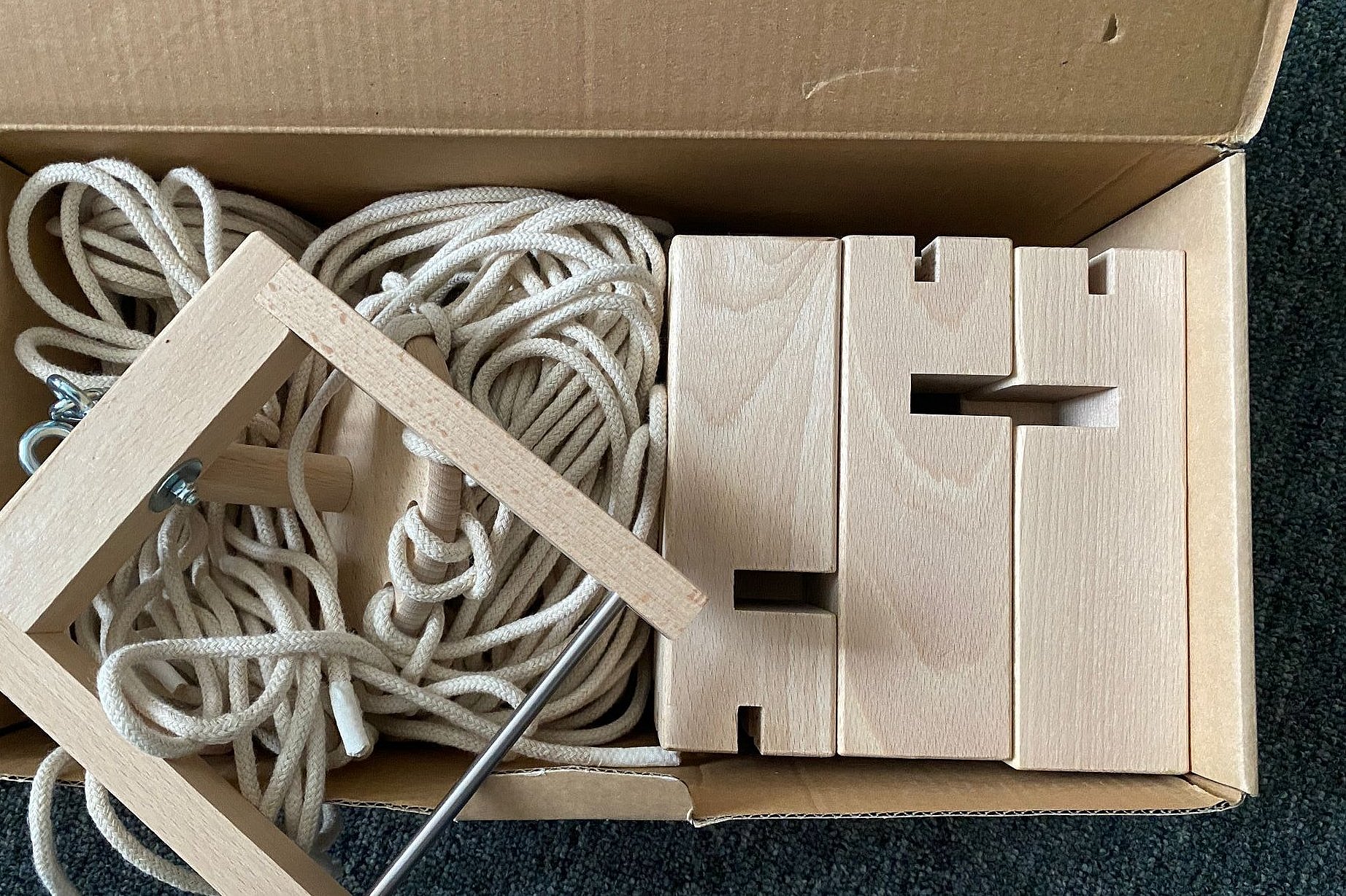 Das Spielmaterial: Wikingerschach beinhaltet einen König, 10 eckige Spielfiguren (Knechte), 6 runde Wurfhölzer und 4 dünne Begrenzungsstäbe.