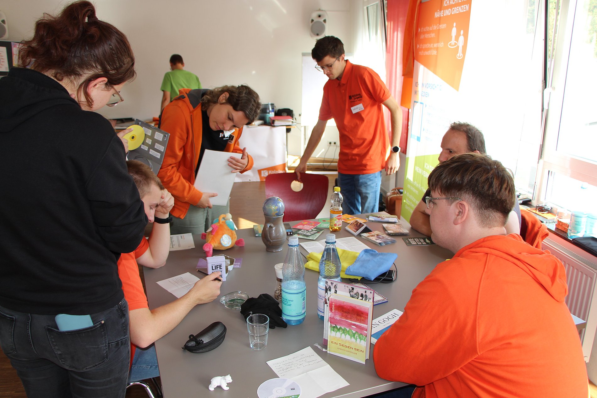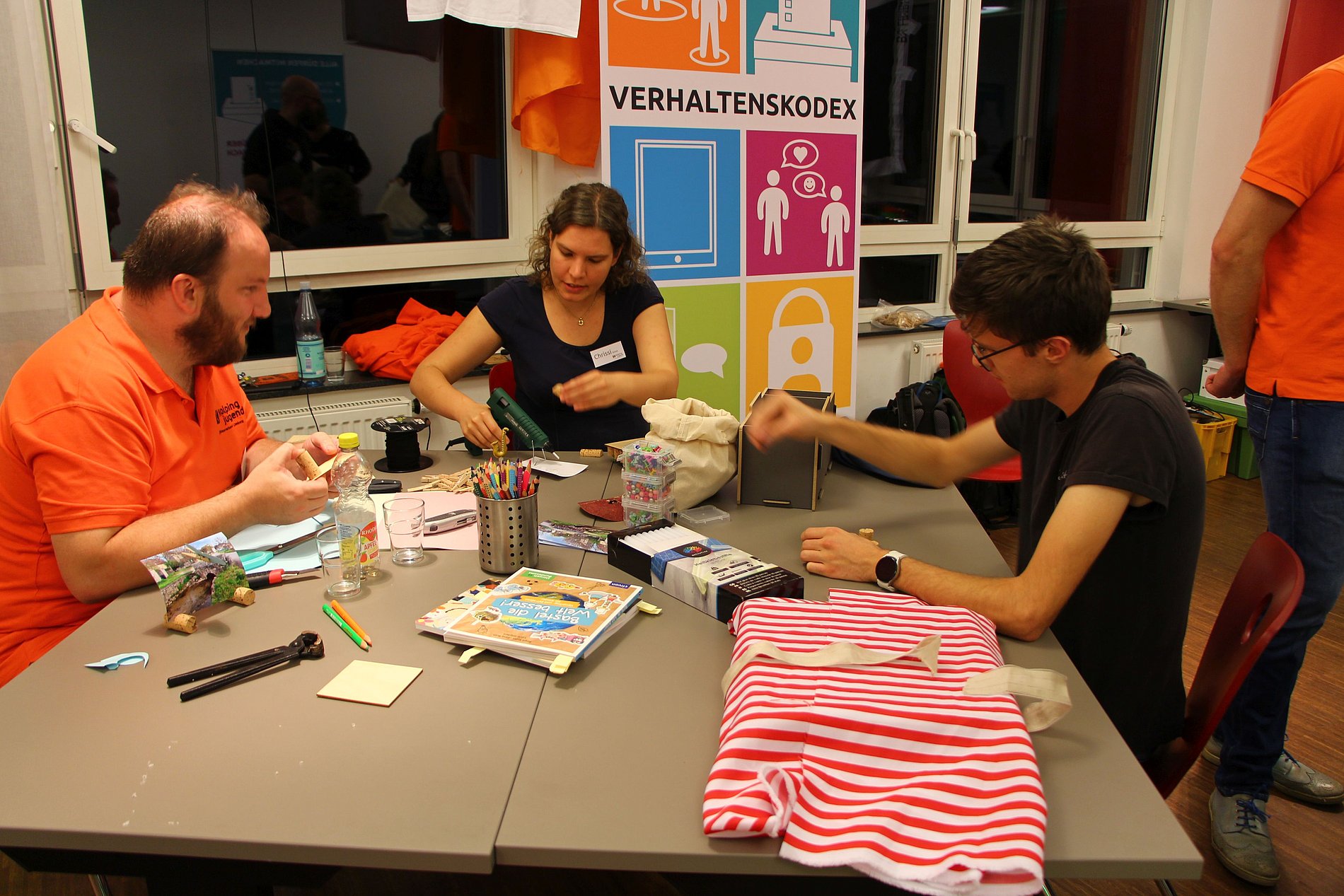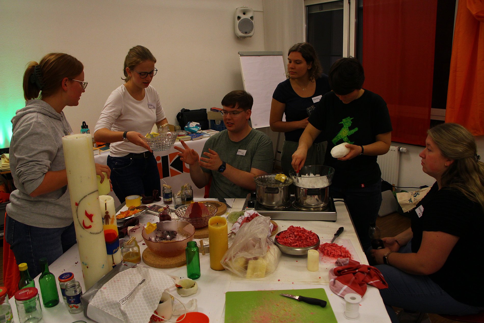 Nach einem Impuls zum Thema Erde Freitagabend, dem gemeinsamen Kennenlernen und der Klärung von Formalia und Organisatorischen, widmeten wir uns gleich der Wertschätzung der Natur. Es gab ein heiteres Beisammensein bei vielen Upcycling-Workshops. So wurden Kerzen aus altem Wachs angefertigt, Pinnwände und Fotohalter aus Korken, Geschenke probehalber in Stoff eingepackt und mit Simeon Harjung vom BDKJ Limburg Jute-Beutel und T-Shirts mit dem Logo der 72-h-Aktion 2024 bedruckt. Daneben begleitete uns auch eine Fotobox das ganze Wochenende. Dieses Jahr gab es dann zum ersten Mal einen Mitternachtssnack: mit zwei Heißluftfriteusen wurden leckere Pommes zubereitet. Ob das schon perfekte Pommes waren? Wer nicht bis Mitternacht warten konnte, konnte sich jederzeit an einer kleinen Snackbar mit Produkten aus dem Unverpacktladen bedienen.