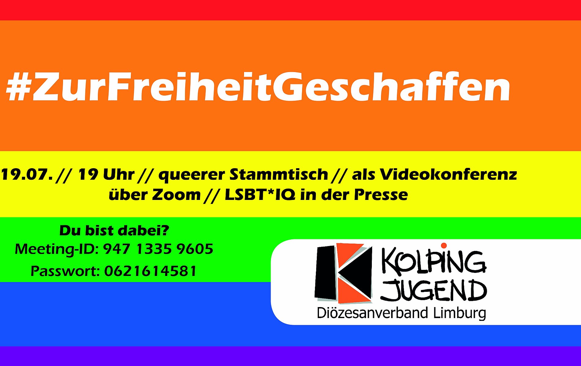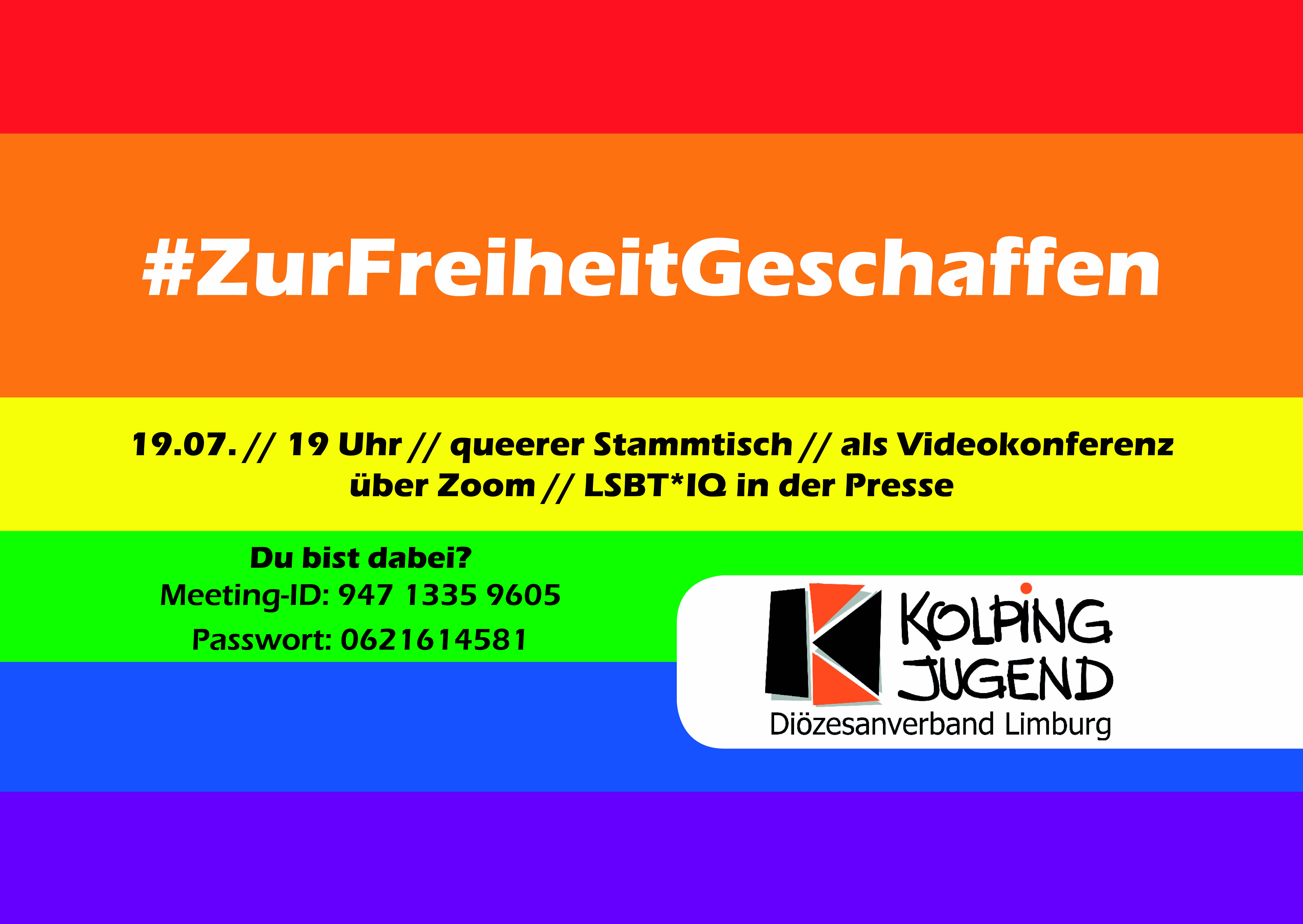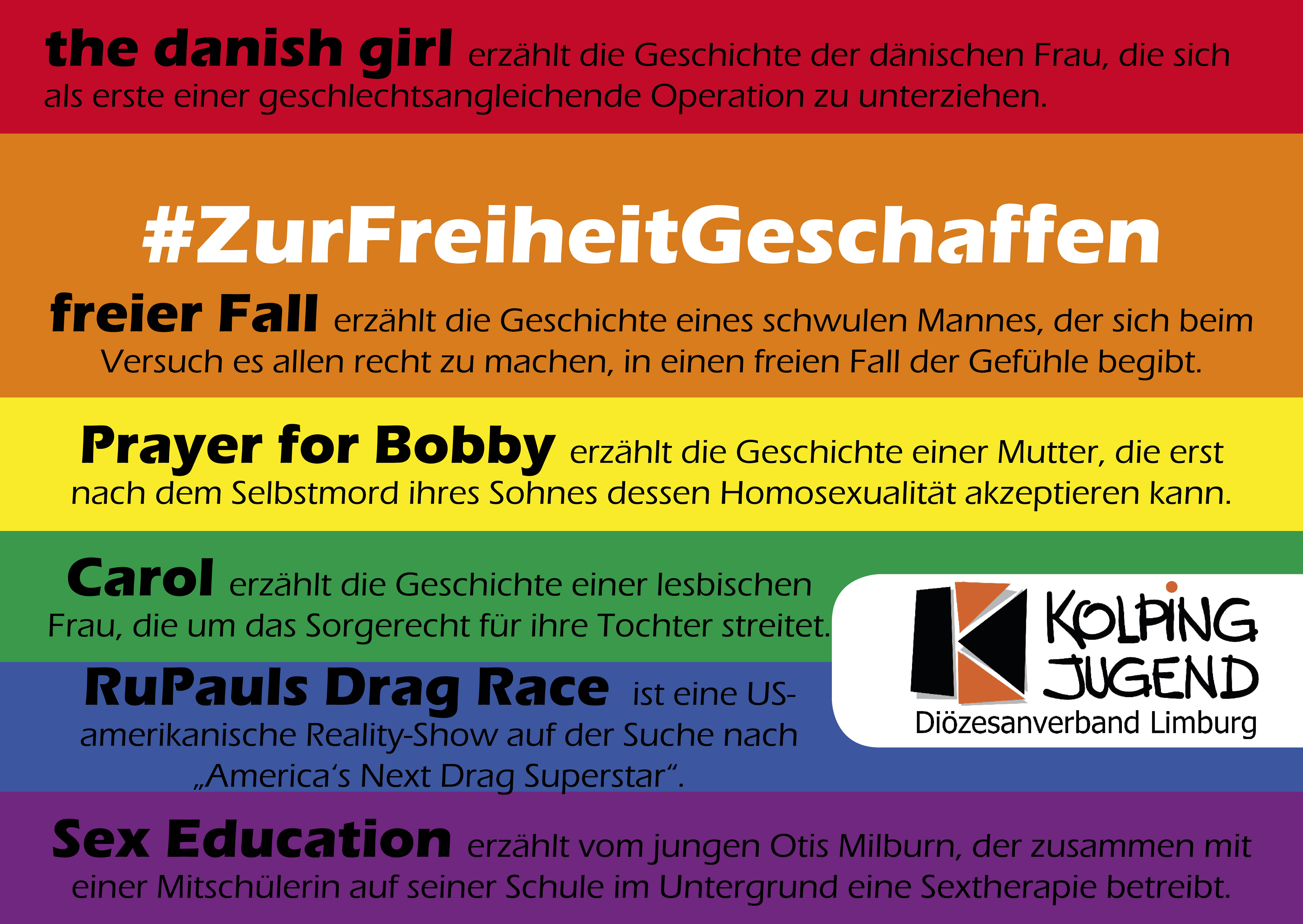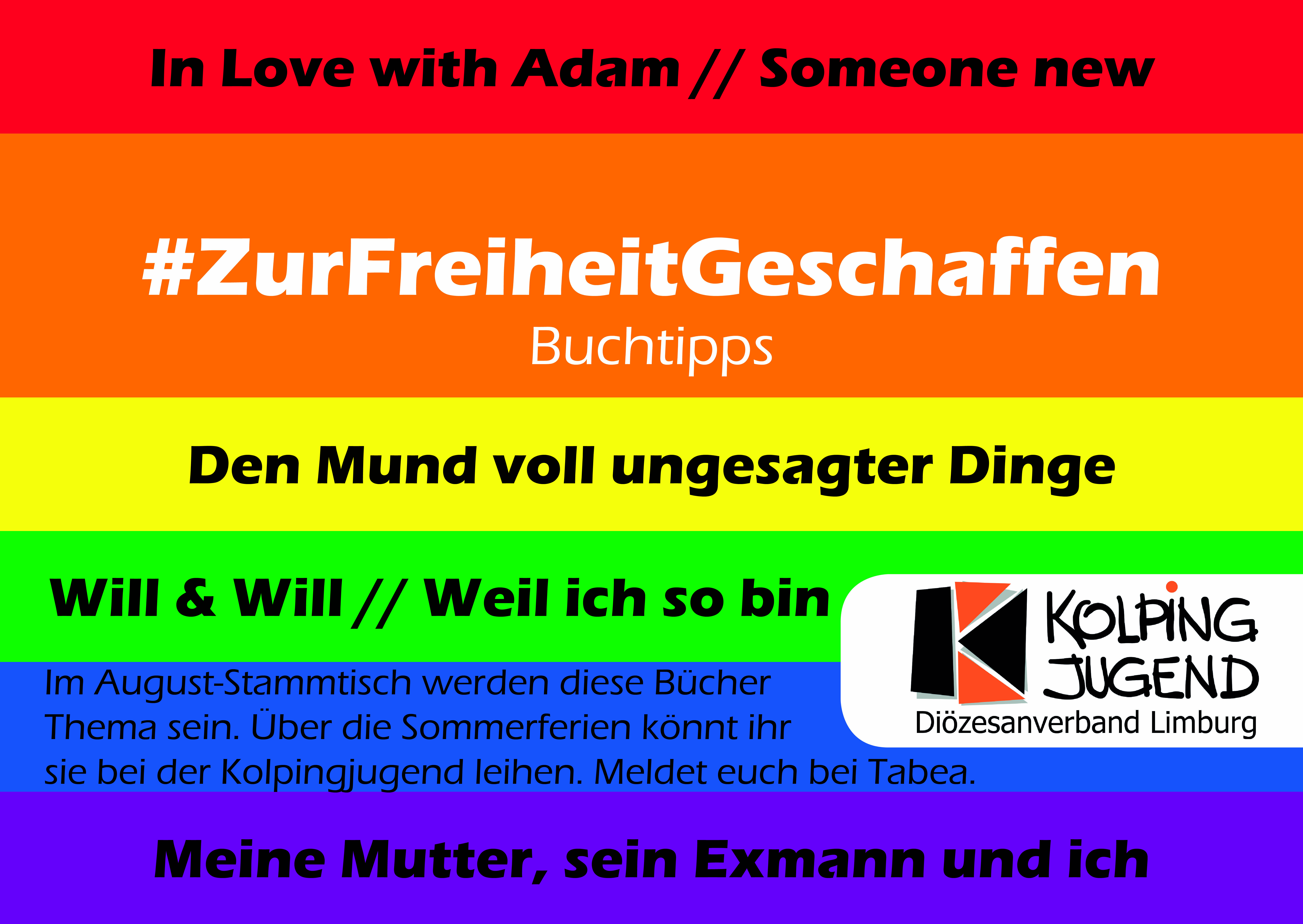 Die besprochenen Themen waren vielfältig und die Sharepics wandelten sich im Laufe der Jahre. Die Kolpingjugend wurde nach und nach vom neu gegründeten Arbeitskreis queere Jugendarbeit Bistum Limburg unterstützt - eine Kooperation zwischen Jugendverband, Jugendkirche und Fachstelle für Jugendarbeit. Für manche Themen entstanden Präsentationen, die wir euch hier gerne zur Verfügung stellen bzw. zum Reinschauen hoch laden. Andere Themen wurden mit Impulsfragen diskutiert. Für Rückfragen steht euch Tabea zur Verfügung.