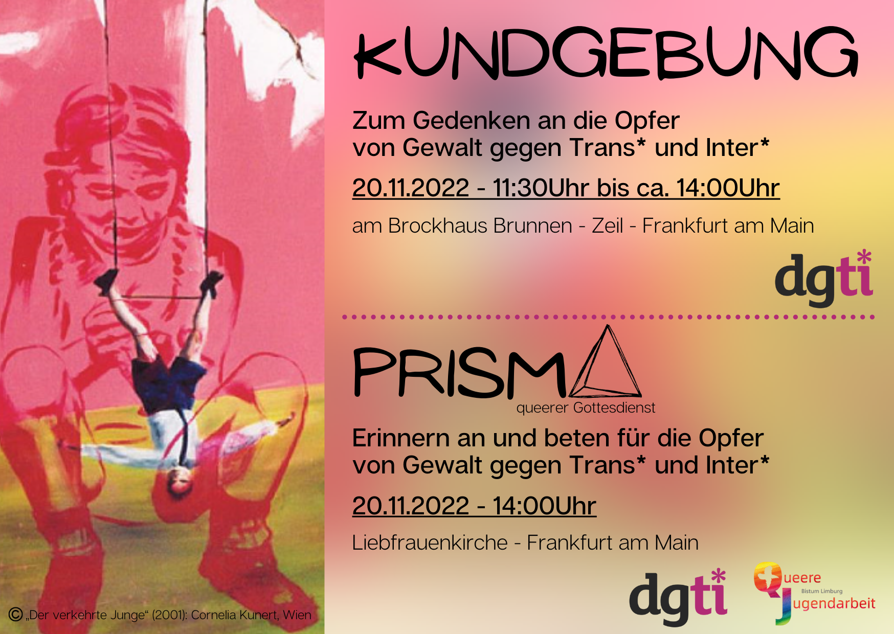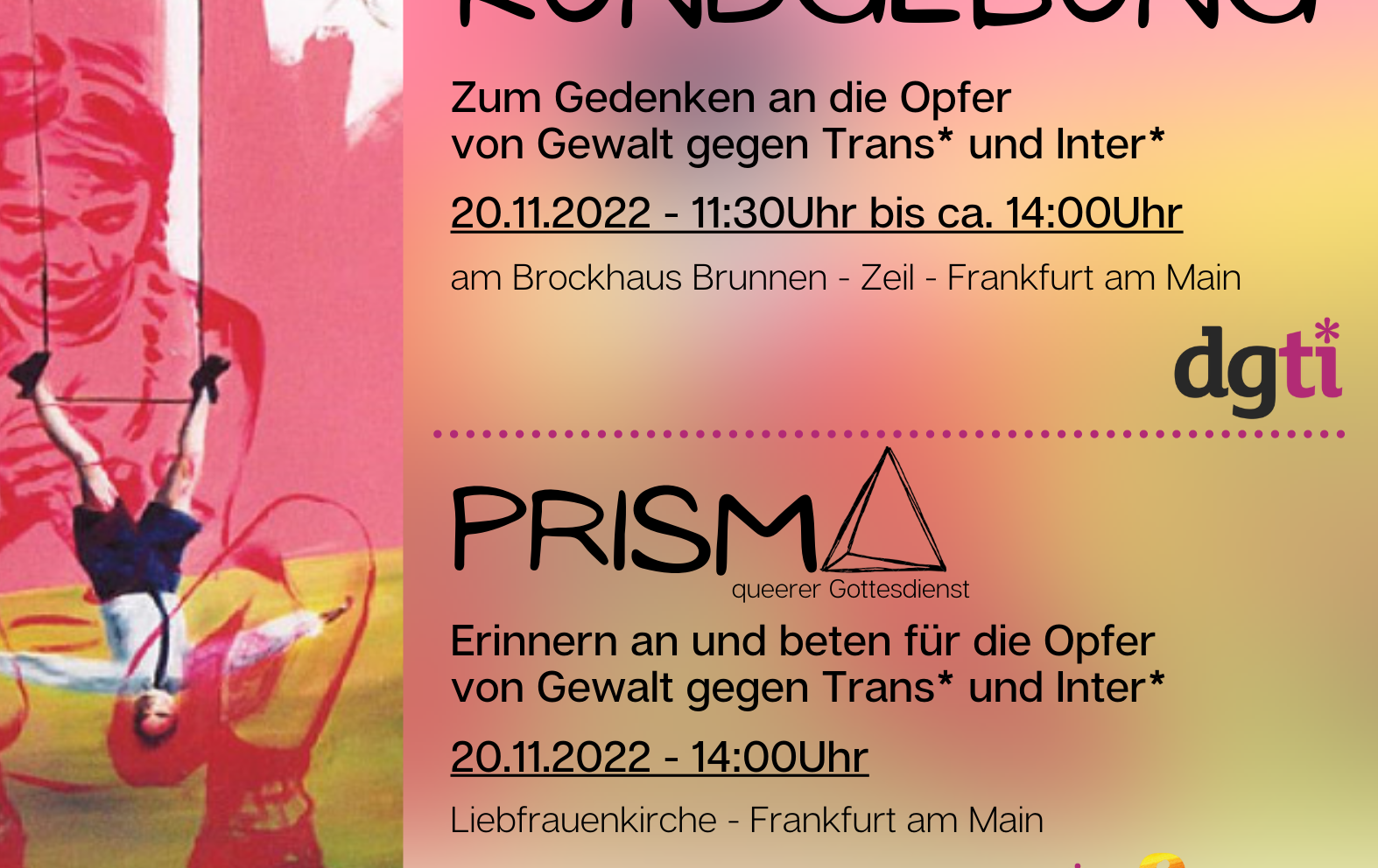2021 und 2022 fanden insgesamt vier Prisma Gottesdienste statt. Zunächst coronabedingt noch online und anschließend an verschiedenen Orten im Bistum Limburg. Der letzte Gottesdienst wurde in Kooperation mit der dgti zum transgenderday of remembrance in Frankfurt gefeiert.