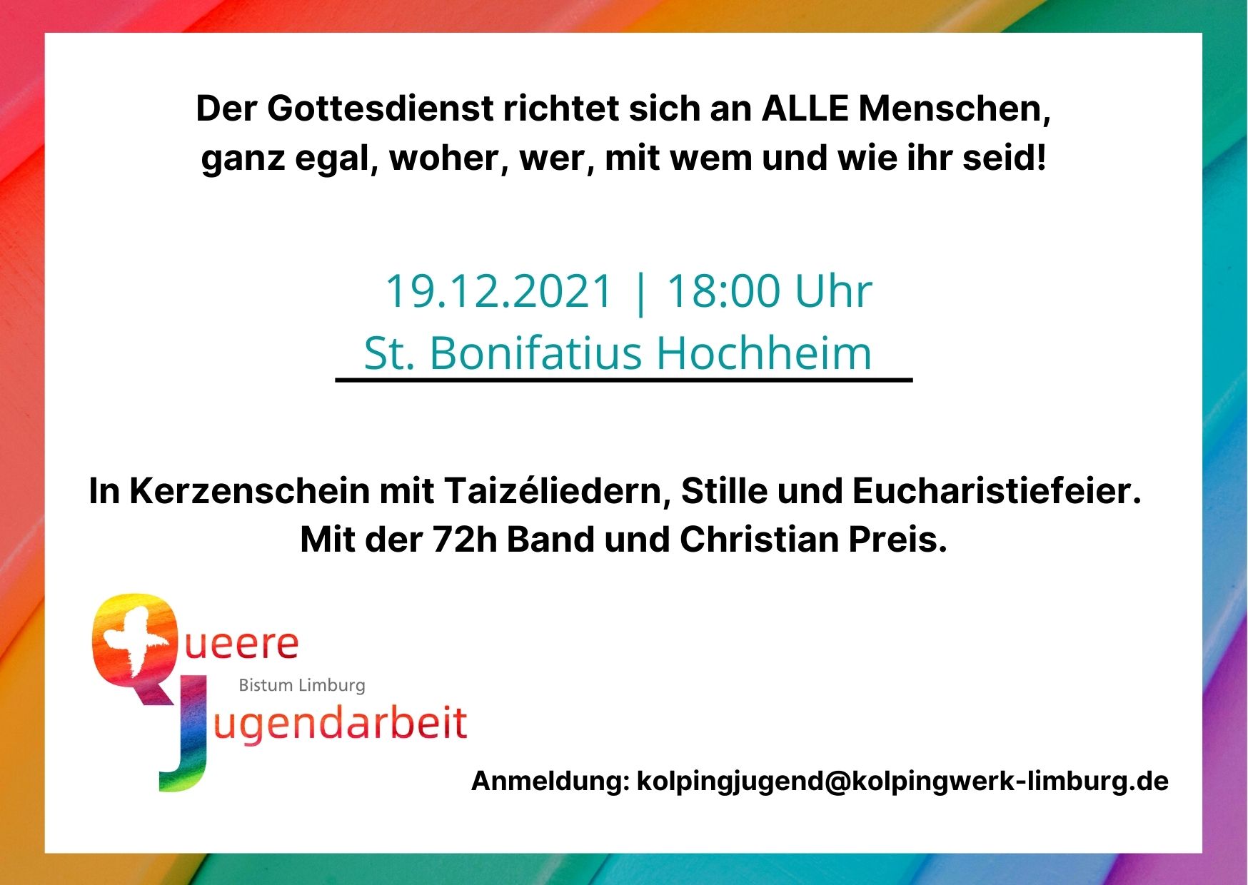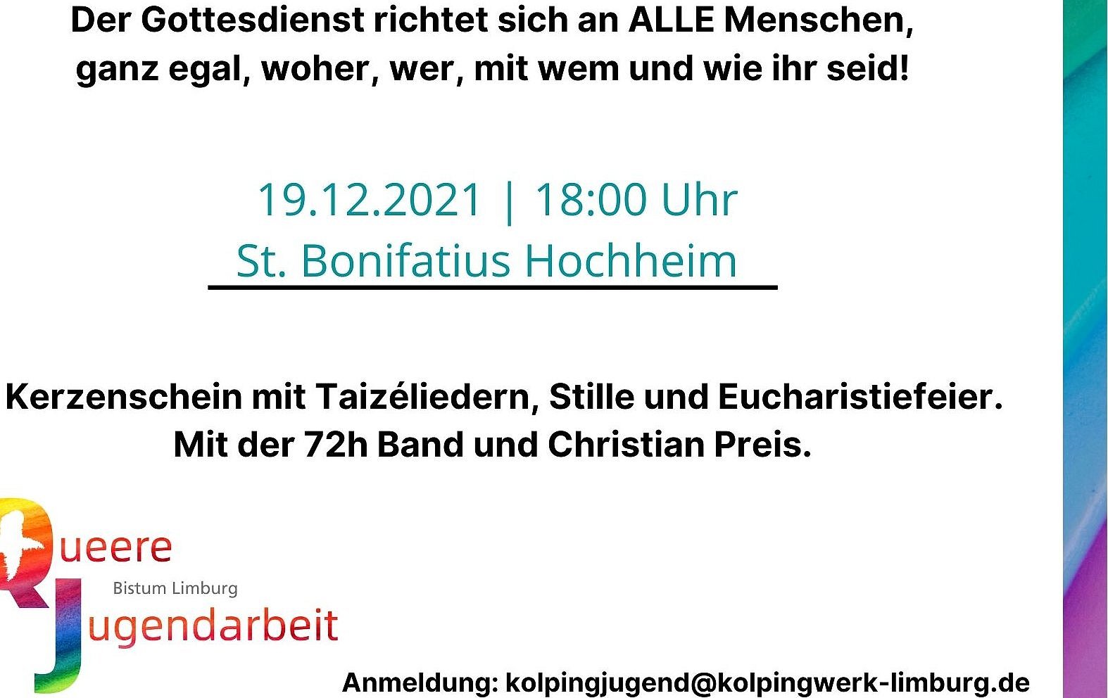 Der Duden bezeichnet Menschen als "queer", die "in ihrer Geschlechtsidentität von einer gesellschaftlich verbreiteten heterosexuellen Norm abweichen". Gerade sie haben es in der Kirche oft schwer – auch pastorale Angebote für sie gibt es bislang kaum. Um dies zu ändern, hat sich im Bistum Limburg aus verschiedenen kirchlichen Einrichtungen ein Arbeitskreis queere Jugendarbeit gebildet, der entsprechende Formate entwickelt – unter anderem einen queeren Gottesdienst, der an diesem Sonntag erstmals stattfindet. Einer der Motoren des Arbeitskreises ist die Jugendkirche KANA in Wiesbaden, die sich bereits seit geraumer Zeit dem Thema verschrieben hat. Jugendbildungsreferent Eric Tilch (26), einer der KANA-Mitarbeiter, stellt den Arbeitskreis und seine Anliegen vor.